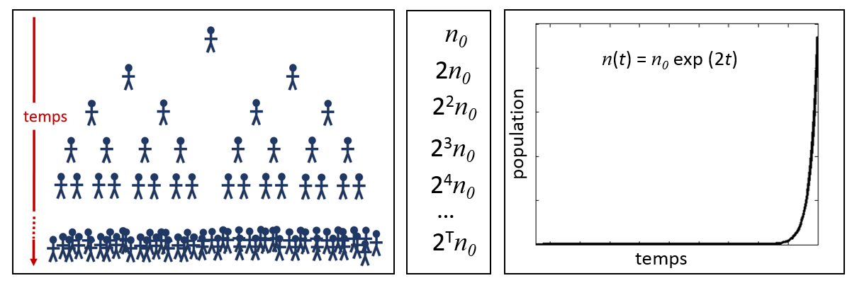 La croissance exponentielle d’une population est représentée à la figure 2.1.1. L’image de gauche illustre la croissance d’une population où chaque individu donne naissance à deux individus au cours de sa vie. L’imagine centrale démontre comment une population de taille initiale n0 augmente d’un facteur de deux à chaque génération. Finalement, la figure de droite illustre l’évolution temporelle de la population n suivant une fonction exponentielle de taux constant égal à deux.
