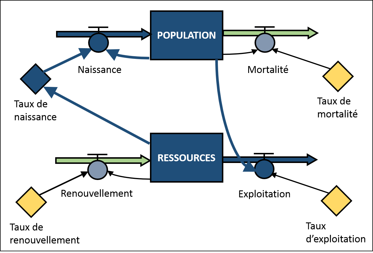 Les processus sont les mécanismes qui contrôlent les flux qui entrent (les entrées) et qui sortent des compartiments (les sorties). Les processus sont donc responsables des changements dans la valeur des compartiments. Dans l’exemple illustré à la figure 2.2.3, le compartiment associé à la population est sujet aux processus de naissance et de mortalité. Les naissances augmentent la taille de la population tandis que les décès la diminuent. De même, le compartiment associé aux ressources de l’île dépend des processus de renouvellement et d’exploitation des ressources.