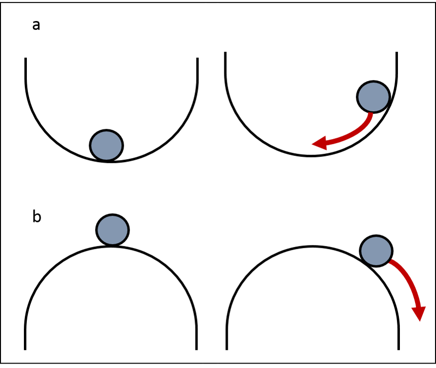 Il est intéressant de constater qu’il existe des équilibres stables et des équilibres instables. Un système est dans un état d’équilibre stable lorsqu’après une légère modification de ses paramètres, le système s’éloigne de son état d’équilibre mais peut y revenir. La stabilité d’un état d’équilibre est souvent illustrée par analogie avec une balle soumise à la force de la gravité (figure 2.2.7). Une balle placée au creux d’un bassin est à l’état d’équilibre. Si la balle est déplacée vers la droite ou la gauche du bassin, elle retournera à sa position d’équilibre une fois relâchée (figure 2.2.7 a). D’autre part, une balle située au sommet d’une montagne (figure 2.2.7 b) ne peut regagner cette position d’équilibre si elle subit un débalancement. Un tel équilibre est dit instable. Si vous désirez en savoir davantage sur le concept d’équilibre et de stabilité des systèmes dynamiques, consultez les pages de scholarpedia equilibrium et stability.