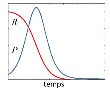 Dynamique produite par deux compartiments en interaction. La croissance du compartiment P(t) dépend du compartiment non renouvelable R(t). |