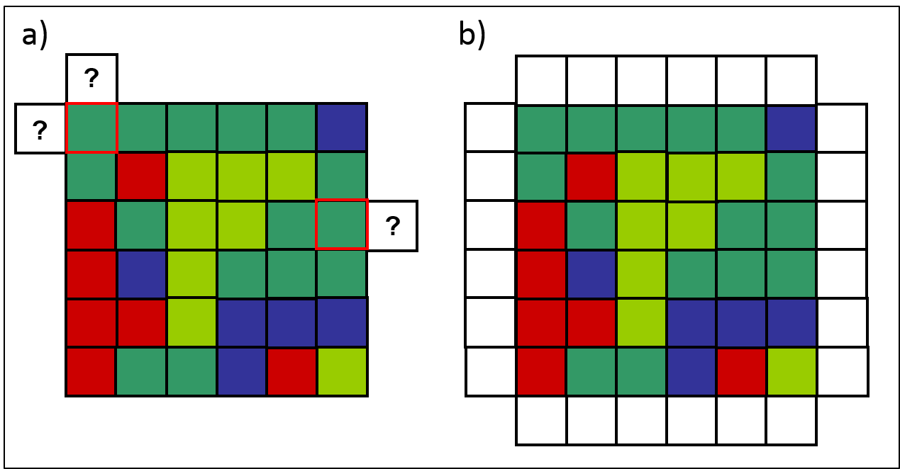 Figure 2.3.13 Les conditions frontières dans l’automate cellulaire représentant un territoire forestier. a) Les cellules en bordure de la grille ont un voisinage incomplet (ici de von Neumann). b) Les conditions frontières sont définies en créant une zone tampon qui entoure la grille de l’automate cellulaire.