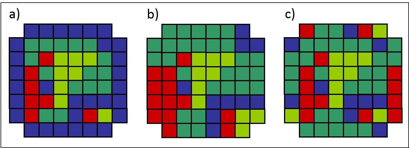 Figure 2.3.14 Les trois types de conditions frontières dans l’automate cellulaire du territoire forestier. a) Conditions frontières à valeur fixe. b) Conditions frontières réfléchissantes. c) Conditions frontières périodiques.