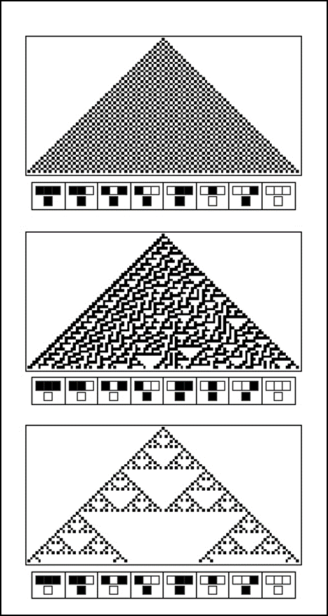 Le physicien Stephen Wolfram a contribué de façon importante à la compréhension de la dynamique produite par les automates cellulaires en étudiant de façon systématique les automates cellulaires à une dimension avec deux variables d’état. La figure 2.3.15 présente trois exemples d’automates cellulaires étudiés par Wolfram.