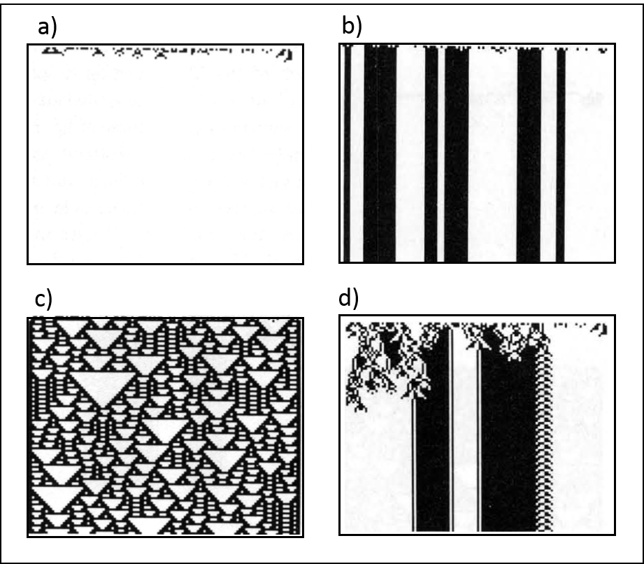 Figure 2.3.16 Exemples des quatre classes de dynamiques selon Wolfram. a) Dynamique homogène. b) Dynamique stable. c) Dynamique apériodique ou chaotique. d) Dynamique complexe. Figure adaptée de Wolfram (1984).
