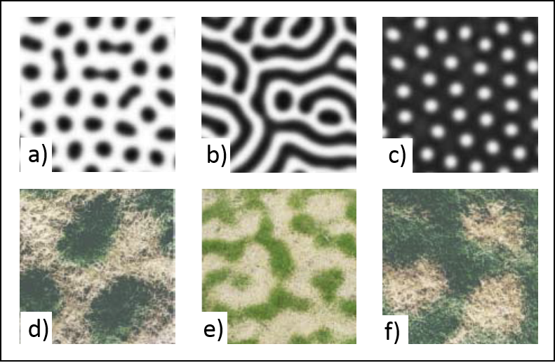 Figure 2.3.4 Patrons spatiaux produits par un modèle de réaction-diffusion (a-c). Patrons formés par l’herbe Paspalum vaginatum, observés dans la région désertique du Negev (Israël) (d-f). La distance entre les patrons d’herbe est de l’ordre de 15 cm. Figure adaptée de von Hardenberg et al. (2001).