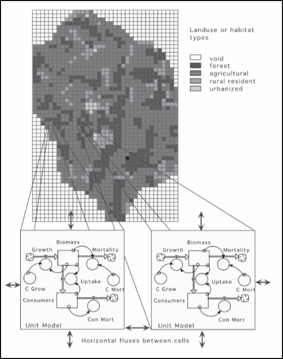 Il est possible d’intégrer la dimension spatiale dans la modélisation systémique à compartiments. Cette approche nécessite de diviser l’étendue spatiale du système à modéliser en cellules. L’espace est alors traité comme une variable discrète. Chaque cellule devient un compartiment du modèle et est liée aux cellules adjacentes par des flux. Les flux peuvent symboliser des échanges d’eau, d’air, d’animaux, d’énergie et de biens et services économiques (Costanza et Voinov, 2004).