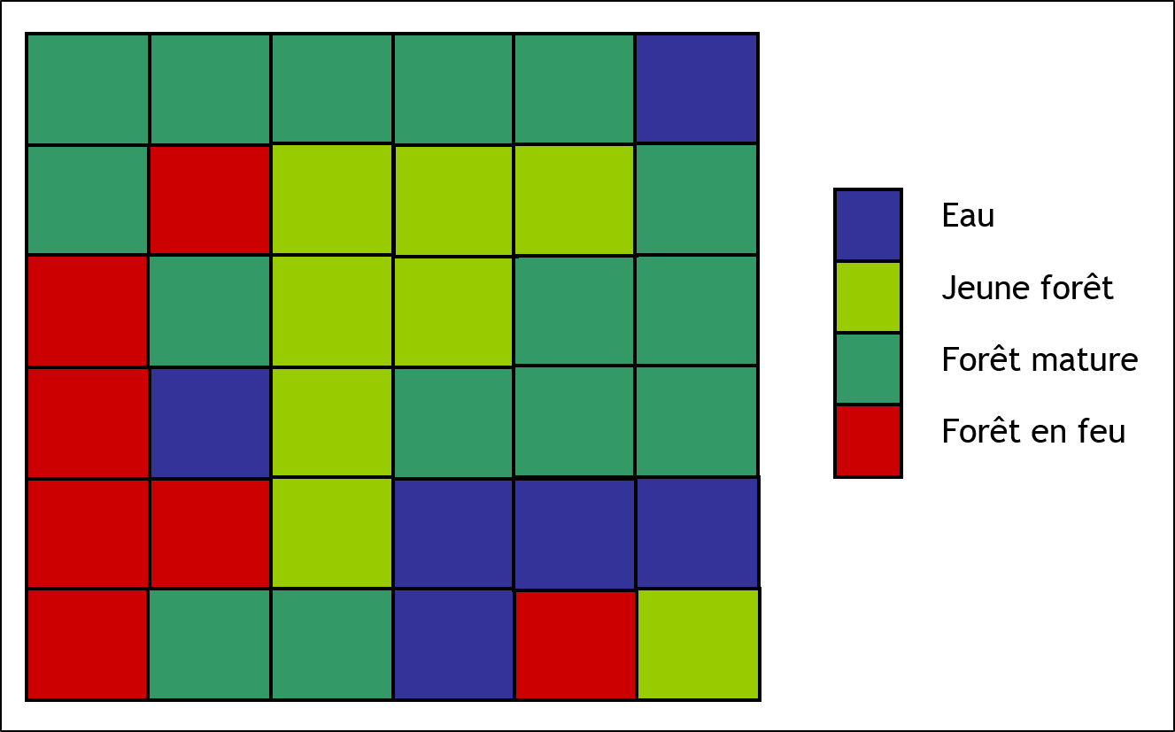 Les états possibles sont les suivants : eau (bleue), jeune forêt (vert pâle), forêt mature (vert foncé) et forêt en feu (rouge).