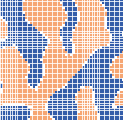 - À la fin de la simulation % similar est environ 75 %. Ainsi, même si les tortues préfèrent un voisinage avec au minimum 30 % de voisins identiques, en moyenne elles se retrouvent avec un pourcentage beaucoup plus élevé. Cet effet de ségrégation est visible sur la grille qui affiche des patrons spatiaux structurés où se regroupent entre elles les tortues de même couleur.