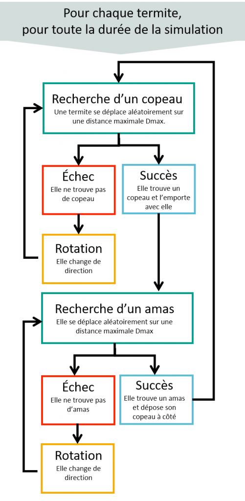 - Chaque termite se déplace aléatoirement sur le territoire (il ne sait pas où sont les copeaux!).